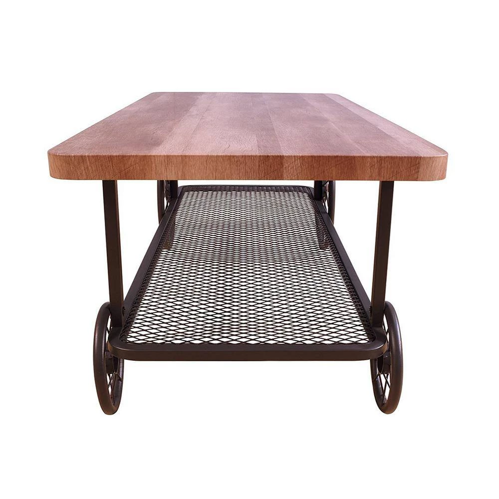 - This table features a butcher block top and metal mesh lower shelf supported by wheels in the form of a cart.