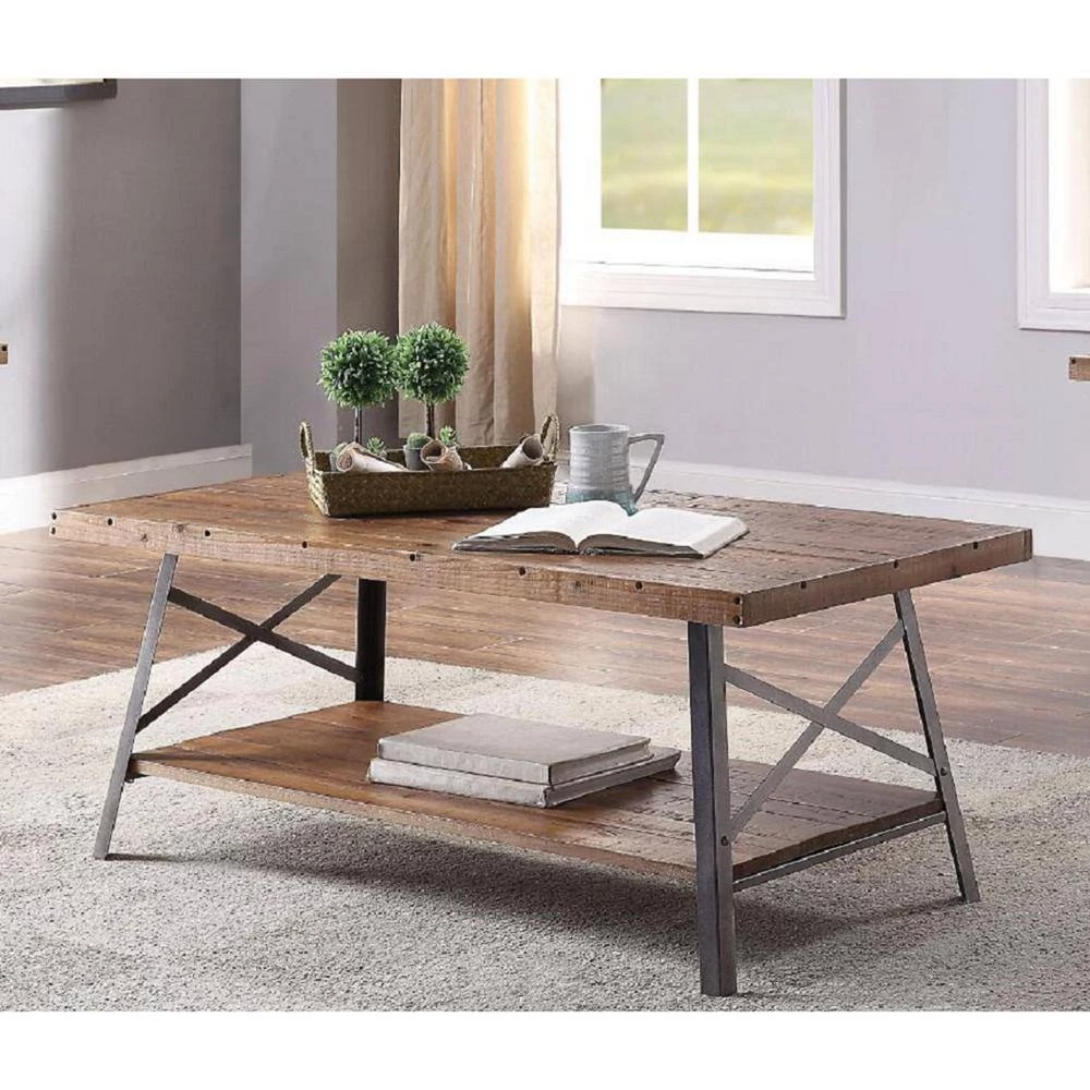 - This distinctive metal and wood cocktail table feature a unique ‘X’ shaped legs with an open lower wood shelf for storage and display.
