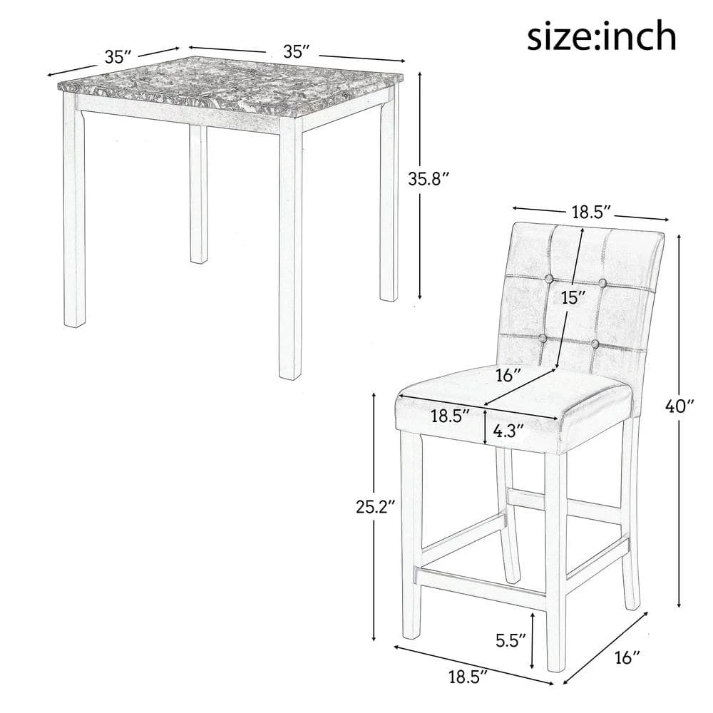- Dimensions: 1 x Counter Height Dining Table: 35″ L x 35″ W x 35.8″ H; 4 x Counter Height Dining Chairs: 18.5″ L x 16″ W x 40″ H