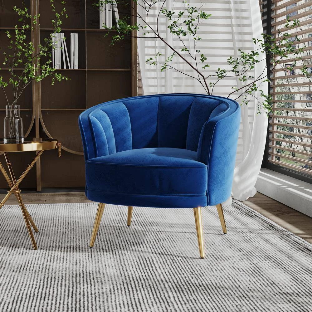 The barrel chair features a seashell-inspired back and gold-finished legs for some contemporary glam style in your living room or den. It has a solid and engineered wood frame, resting on four metal legs for a bit of shining contrast. This chair showcases velvet upholstery to give your space a luxe look, while foam-filled cushioning provides extra support when you’re curled up with a good book or enjoying some late-night TV.