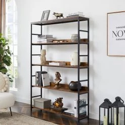 68.9 in. Brown Wood 5-Shelf Standard Bookcase with Metal Frame by Wateday