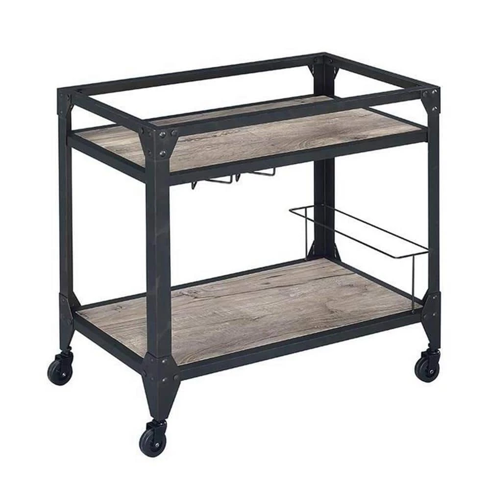 - Showcasing an industrial design, it features a metal frame in a matte black finish, 2-shelves wrapped in wooden veneer and plank-inspired canvas prints