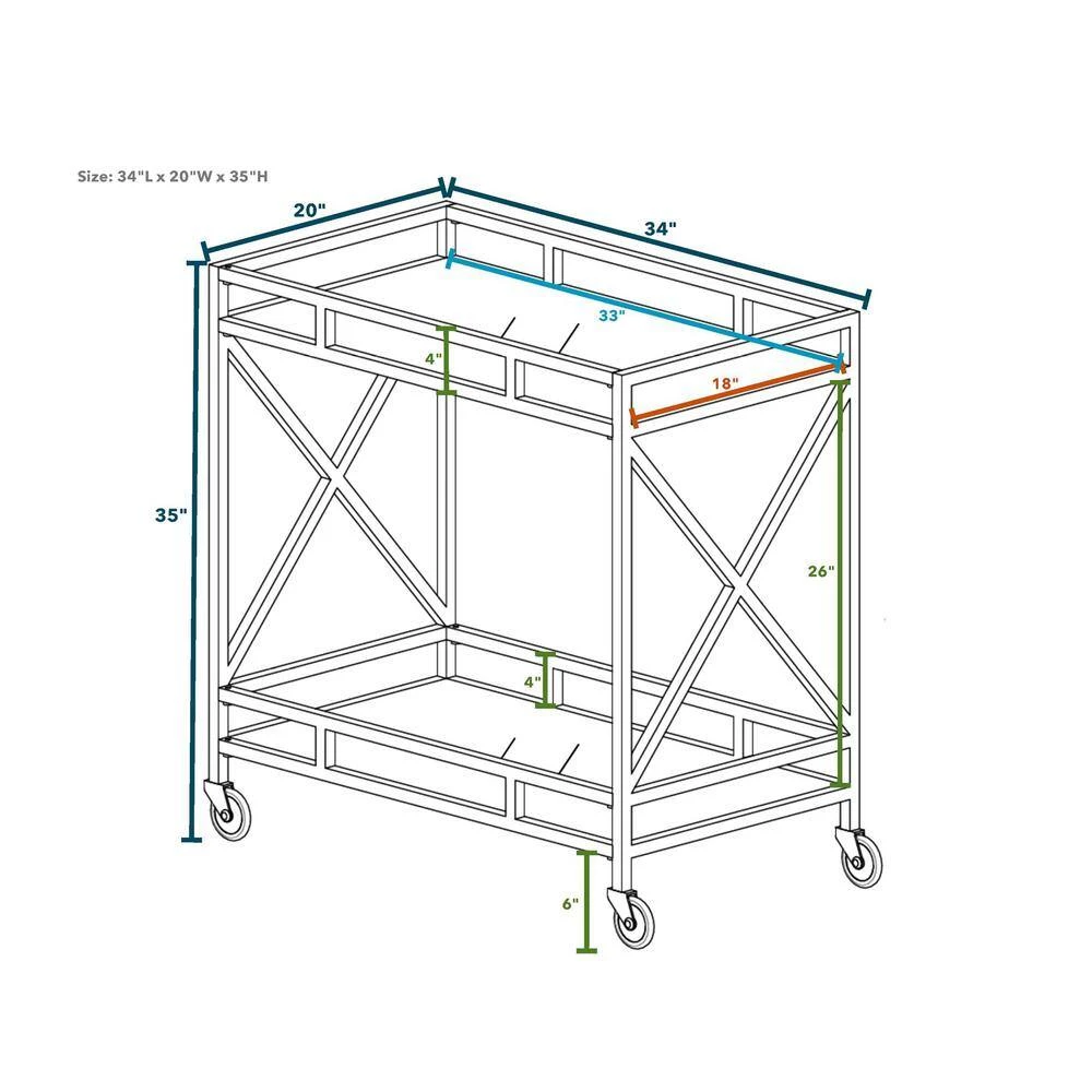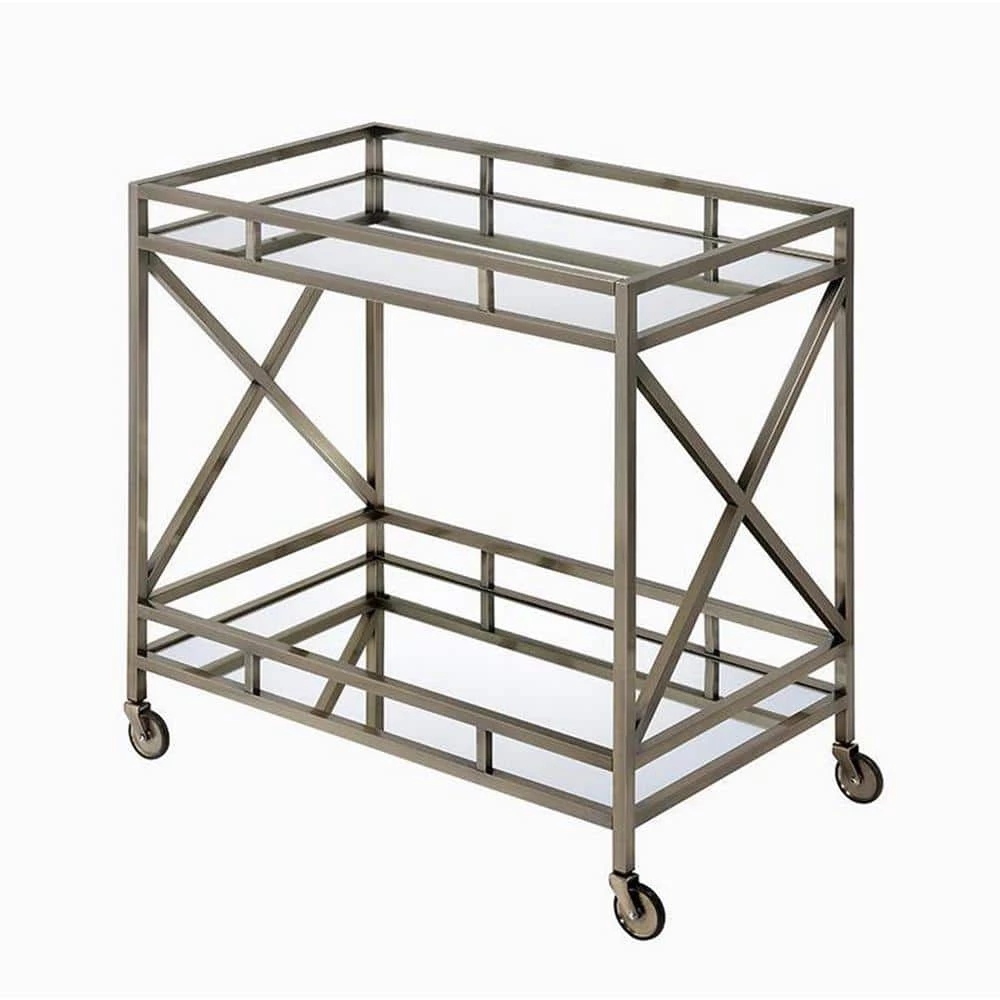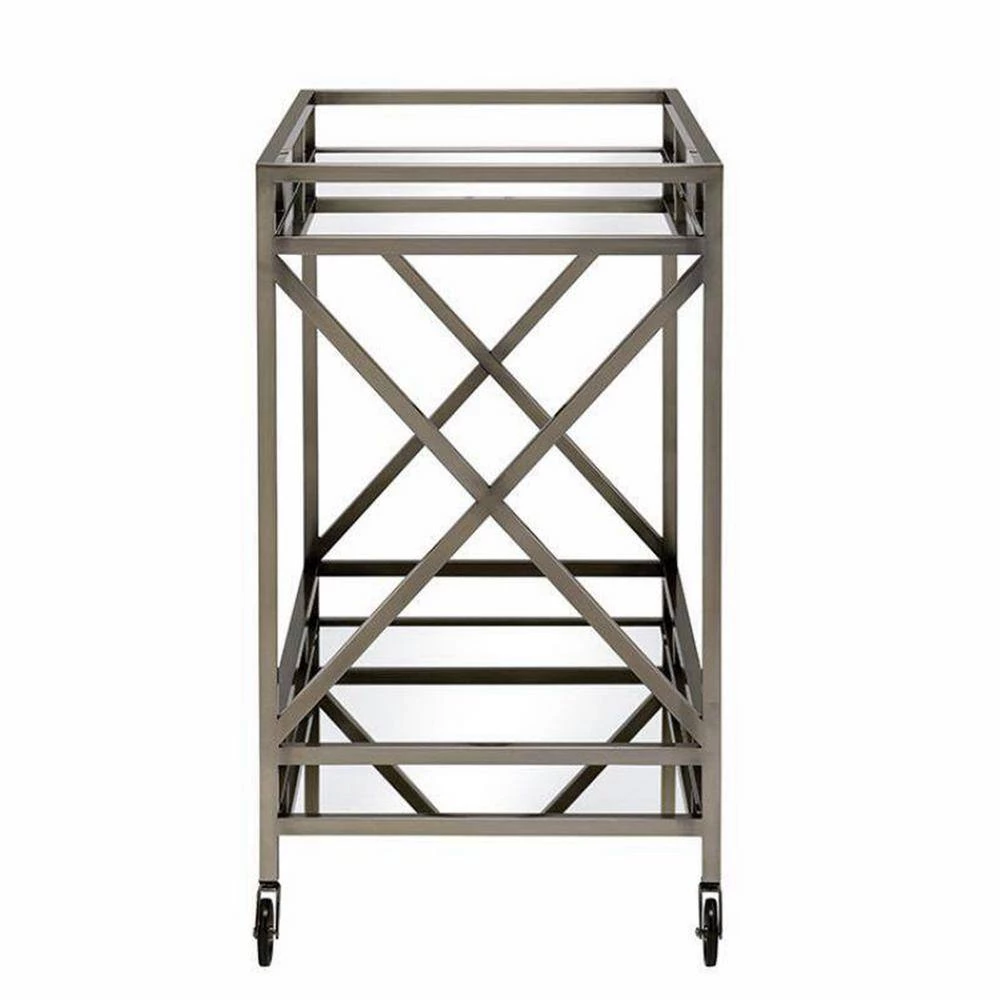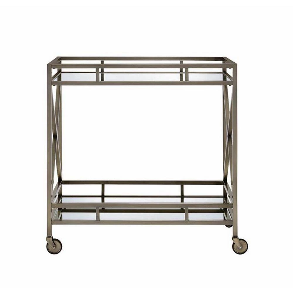 - Openwork metal frame finished in antique brass with 2-tiered mirror design and 4-caster wheelbase effortlessly rolls around