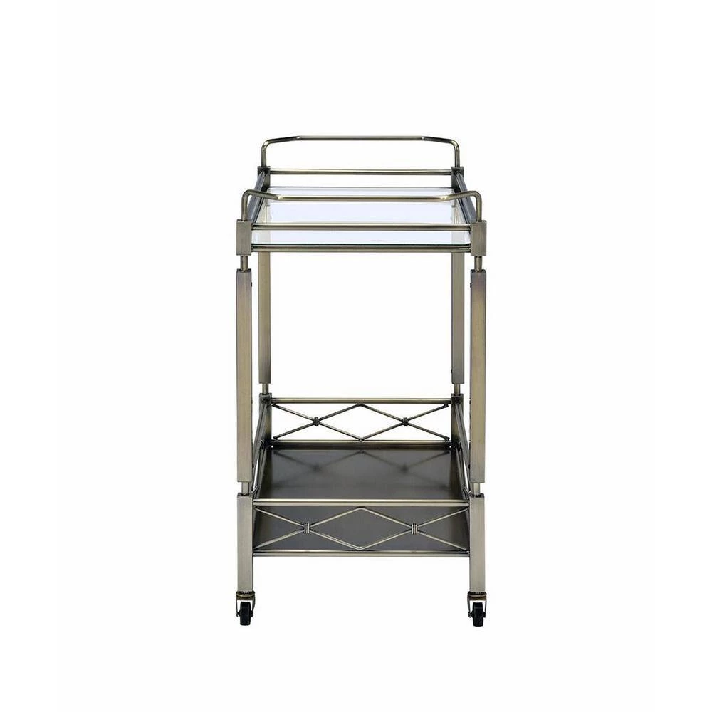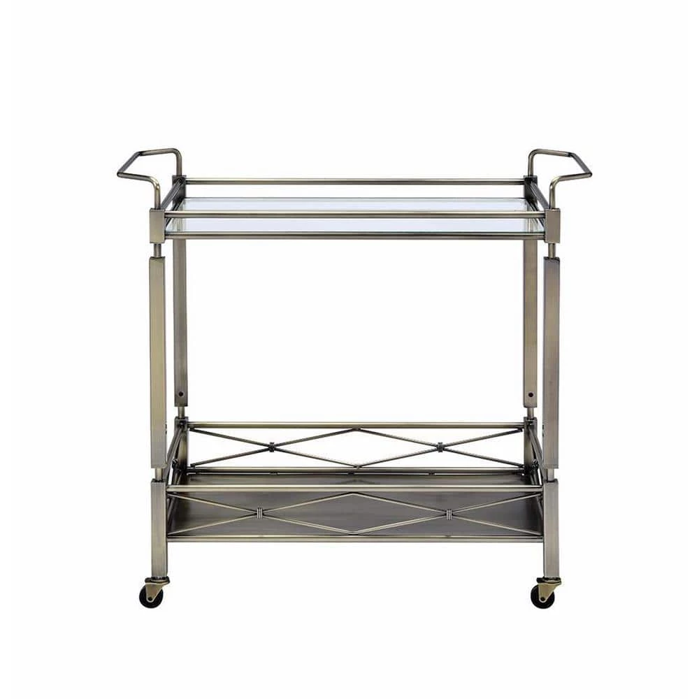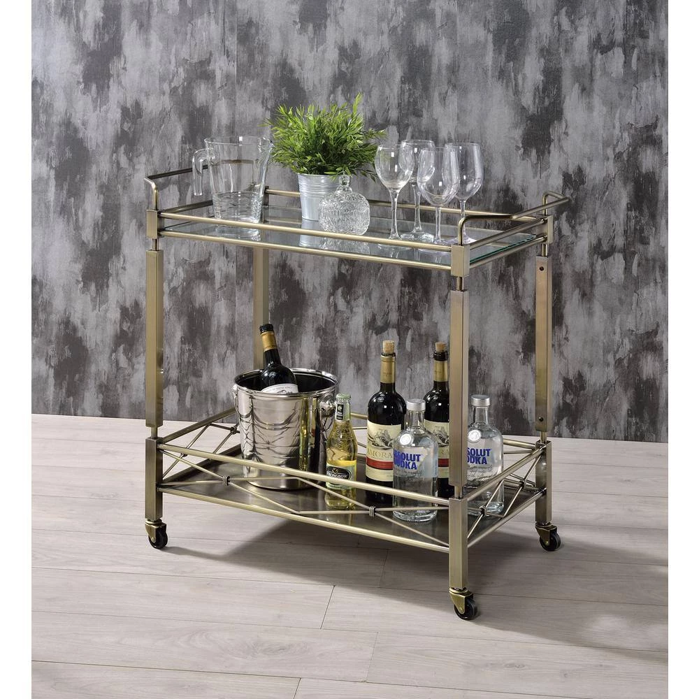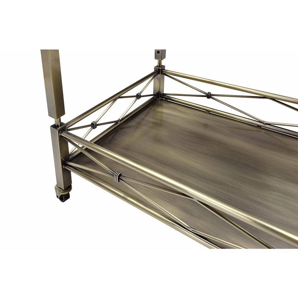 - With metal in antique brass finish and clear tempered glass on top shelf caster wheels allow you to move from room to room effortlessly